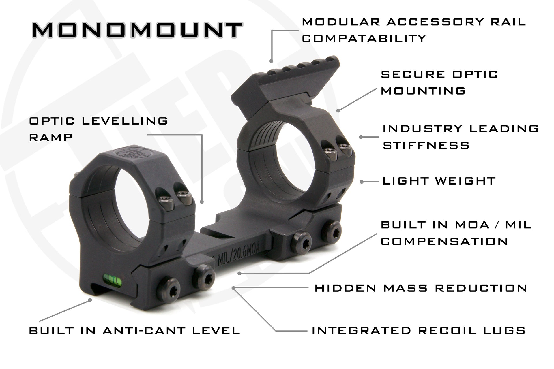 The Tier One Monomount is a true one-piece mount machined from a single, solid billet of 7075T6 aluminium alloy. All critical faces are machined in one operation which ensures the highest possible tolerances, and the greatest accuracy downrange for you.